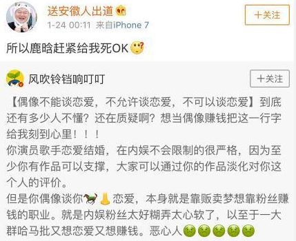 起因是有网友扒出朱正廷粉丝在微博里说“偶像不能谈恋爱,不允许谈恋爱,不可以谈恋爱”,然后被人转发@了鹿晗。