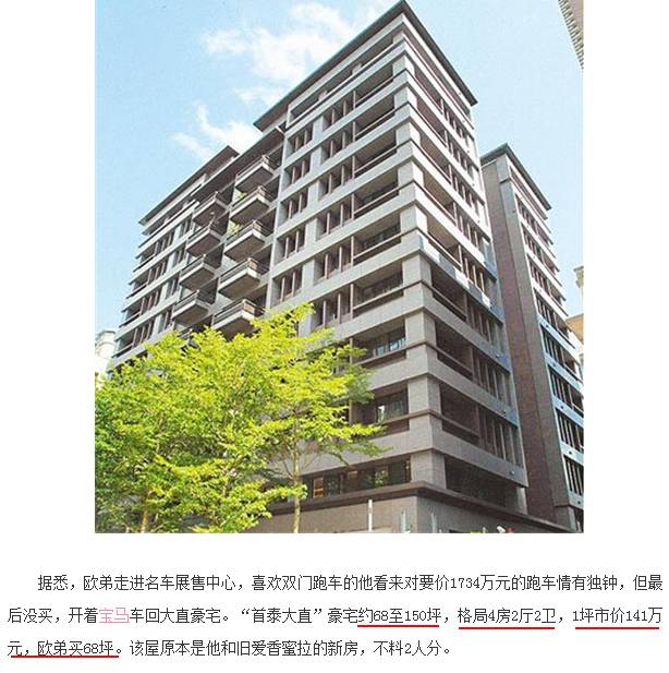 台湾的1坪大约相当于3.3平方米,68坪大约是220平方米。欧弟的这套豪宅,价格约是9588万台币,相当于人民币1880万!