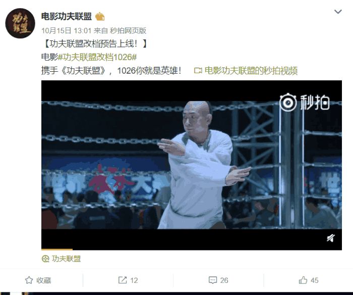 10月15号电影《功夫联盟》官方微博正式宣布改档至10月26号