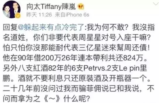 这些指向明显的内容,直接惹火了向华强的太太陈岚,她一怒之下在微博上接连炮轰周星驰,爆料周星驰欠钱不还,骂他是个缩头乌龟,还发长文细数自己与周星驰的恩怨情仇。