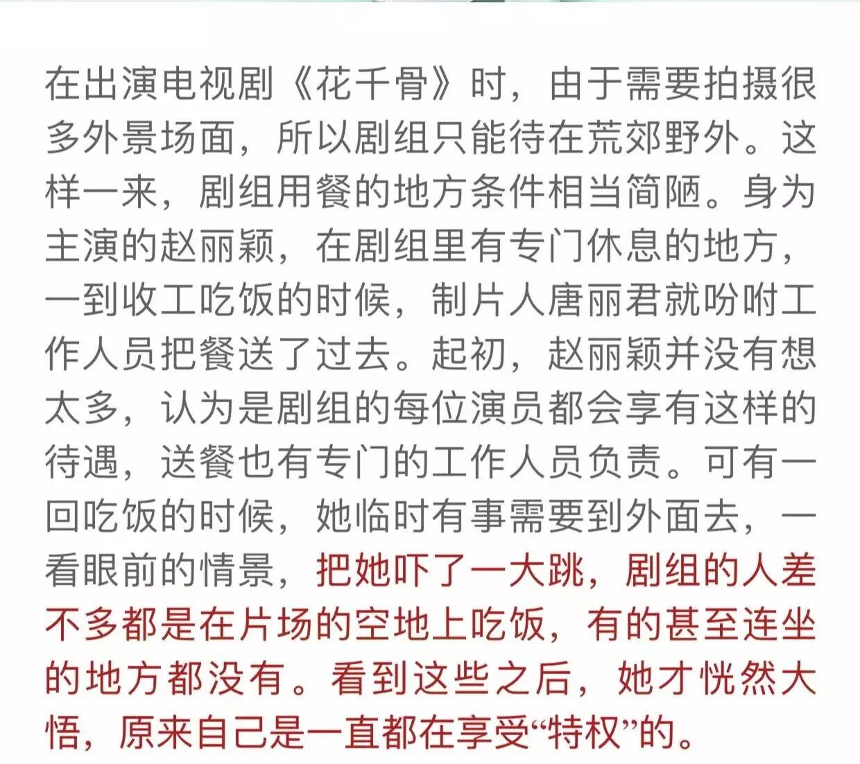 和朴树的鸡汤文一样,这篇文章很快就在微博微信刷屏了,一时间大家都在夸赵丽颖没有明显架子,不仅演技好还不享受明星特权,颖宝一级棒!