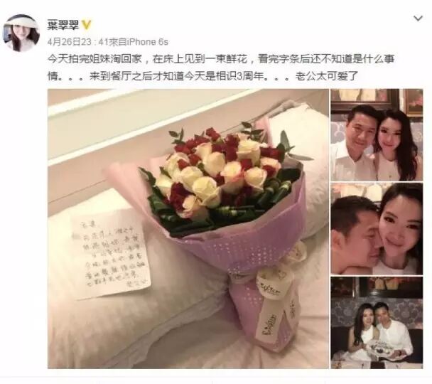 叶翠翠见到当然很甜蜜啦,但是这位人妻特别粗心,去到餐厅才知道庆祝相识纪念日,她在微博自爆:「今天拍完姐(姊)妹淘回家,在床上见到一束鲜花,看完字条后还不知道是什么事情……来到餐厅之后才知道今天是相识3周年……老公太可爱了!」