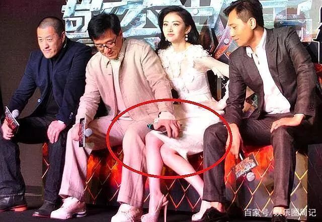 比如成龙有一次与景甜还有刘烨出席一场发布会。当时现场还是有非常多记者的。景甜还穿着一条裙子,双腿并拢着。成龙却把手放在了景甜的大腿上,而且刘烨看的也是一脸内涵笑。