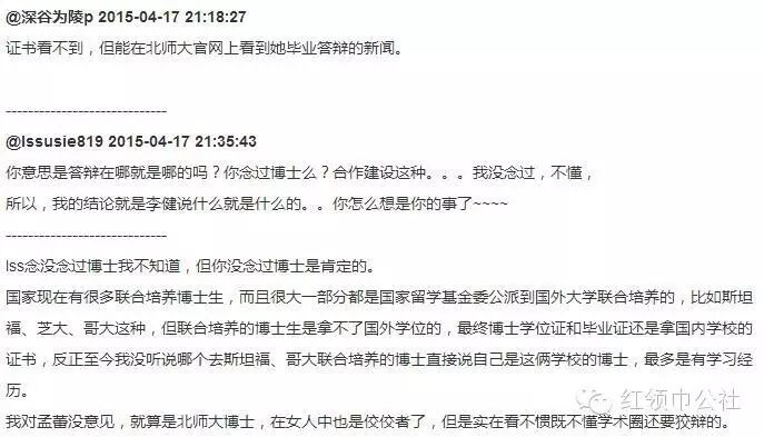 天涯上有网友回应:“本硕人大,还是北师大博士毕业,女人中的佼佼者这确实没错,然而确实不是清华授予的博士学位,为啥就不能说是自己北师大博士呢?”