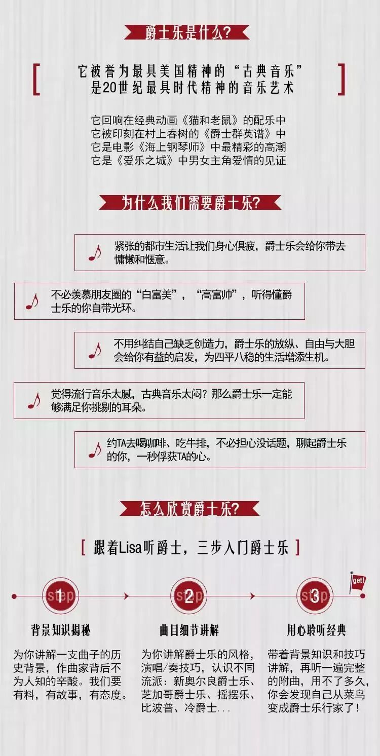 通过最系统同时又最深入浅出的方式,拨开漂浮在爵士乐上空的层层迷雾,莉莎将带大家成为品玩爵士乐的行家。