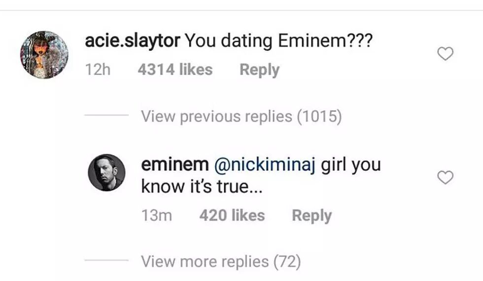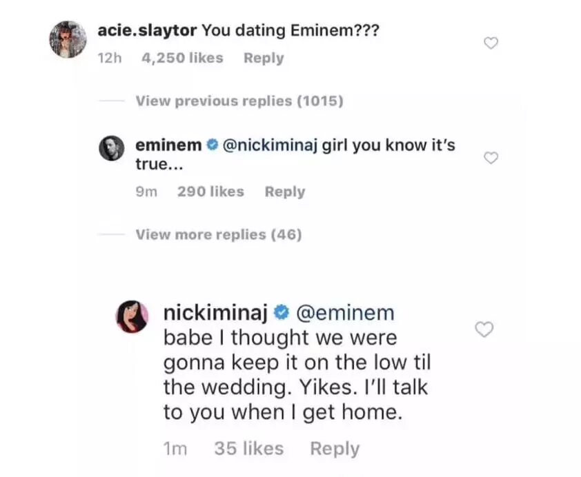 接着几小时后,Eminem阿姆留言回应:「@NickiMinaj 妹纸,你知道这是真的......」