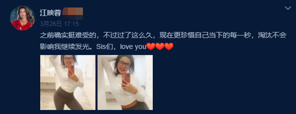 近期,江映蓉在参加某综艺节目时,因为超强的唱跳功力大放光彩,遗憾的是,在最近的节目中,江映蓉被淘汰了,面对被淘汰的结果,她本人在社交平台发文称现在更珍惜当下的每一秒,淘汰也不会影响她继续发光。