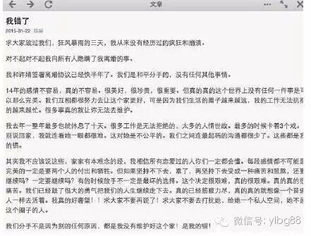 2015年1月22日晚,男星陈赫在新浪发表长微博《我错了》表示已离婚,只字未提疑似出轨对象张子萱。2015年1月27日曾在23号表示陈赫“道歉信”内容不属实的风行娱乐放出“陈赫张子萱热吻”视频,出轨门再次轰动。