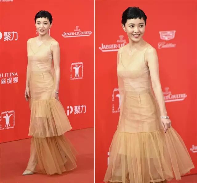 头发越来越短的郭采洁一系裸色纺纱长裙,个子小巧的她感觉有点Hold不住啊。