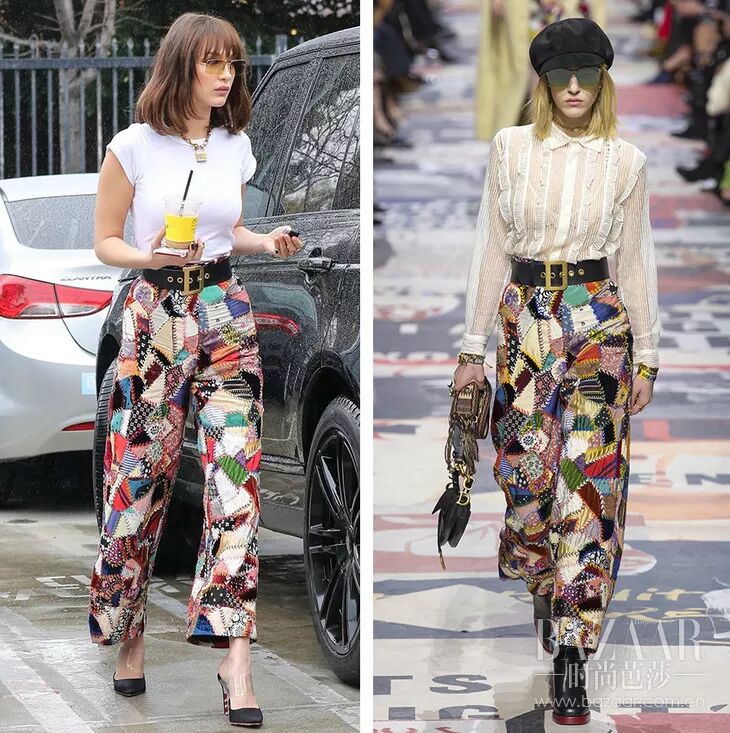 在选择的时候,还可以选择自带亮点的九分超宽阔腿裤!Elsa Hosk这条来自I.AM.GIA的蓝色迷彩阔腿裤,相当花哨,但她搭配得很清新!用浅蓝牛仔短外套和白上衣制造清爽感,蹬上一双穆勒鞋,看上去随性且时髦~