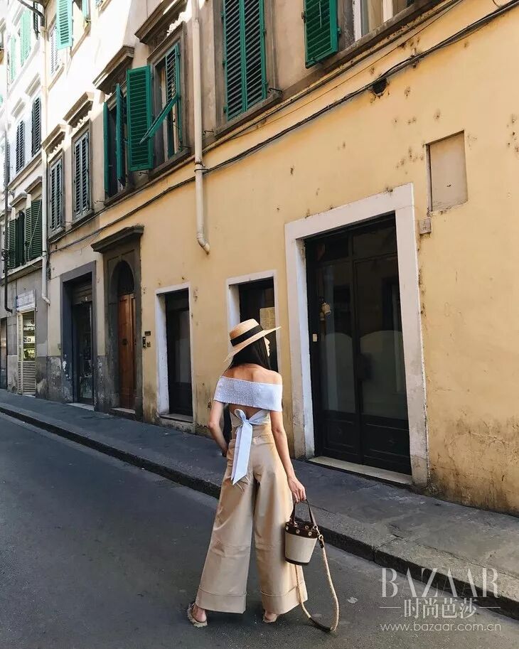 但切记,梨型身材的小伙伴穿九分超宽阔腿裤的时候,一定要露出你身上纤细的一部分,保守的女生可以露出你的手臂或者是脚踝,让视觉产生误差,让被遮盖的腿看上去和露出的纤细部分一样瘦!