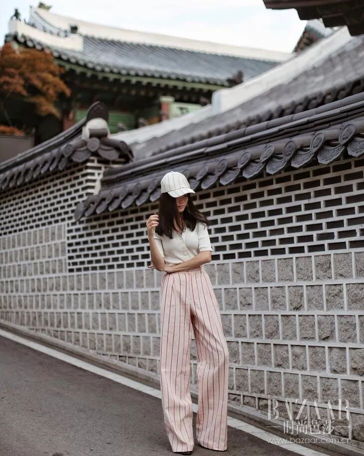 除了格纹款以外,本身就显瘦的竖条纹裤大家了解一下?由于裤子有些花哨,这时候选择的干净利落的白上衣就好~