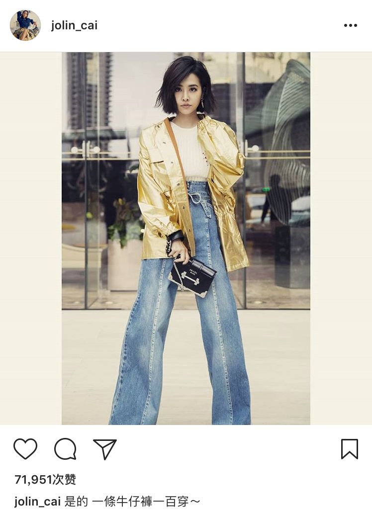 然后发现Jolin真的做到了……这条牛仔裤她从去年的冬天,一直穿到今年的春夏!你是不是在疑惑,这条又长又宽的牛仔阔腿裤到底是怎样俘获Jolin的心?
