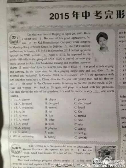 前一阵一组网友搜集的鹿晗出现在中学各种试卷和学习类报刊的图片频频刷屏上热搜:听力鹿晗,完形填空鹿晗,阅读理解鹿晗,鹿晗翻译,作文鹿晗……