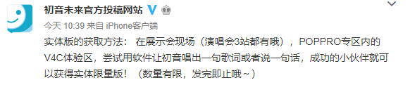 同时实体版专辑,初音未来官方投稿网站也发表说明,“在展示会现场POPPRO专区内的V4C体验区,尝试用软件让初音唱出一句歌词或者说一句话,成功的小伙伴就可以获得实体限量版!”