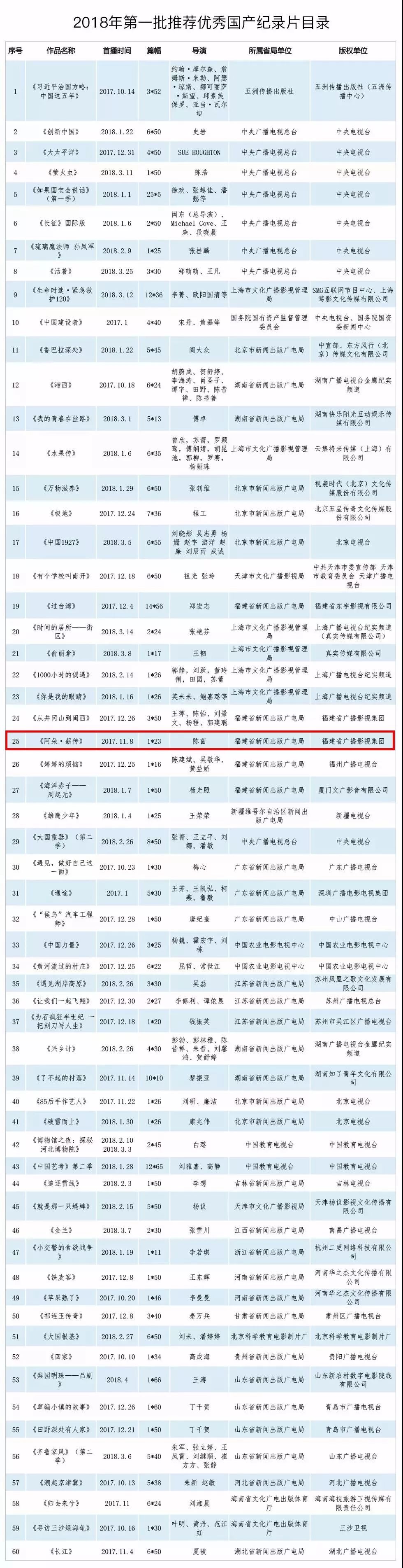 近日,总局发布《国家广播电视总局关于推荐2018年第一批优秀国产纪录片的通知》(以下简称《通知》)。《通知》显示,为充分发挥季度推优纪录片的示范引导效应,总局宣传司日前组织相关广电机构负责同志和专家学者进行评审,从全国选送的212部纪录片中推选出60部2018年第一批优秀国产纪录片。