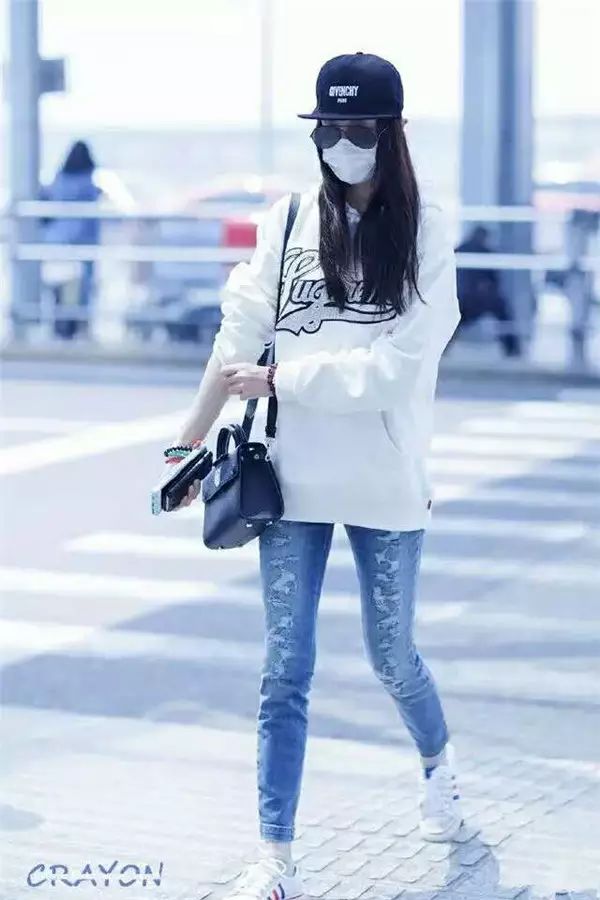 ▶白色连帽卫衣配牛仔裤和小白鞋,气质清纯,简单干净的造型显得很清爽。