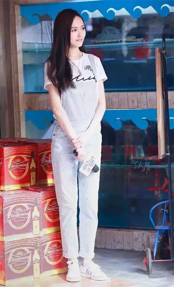 ▶减龄浅色条纹的背带裤内搭白色印花T恤。脚上配一双带有彩色明线的小白鞋,整身造型更加有活力。