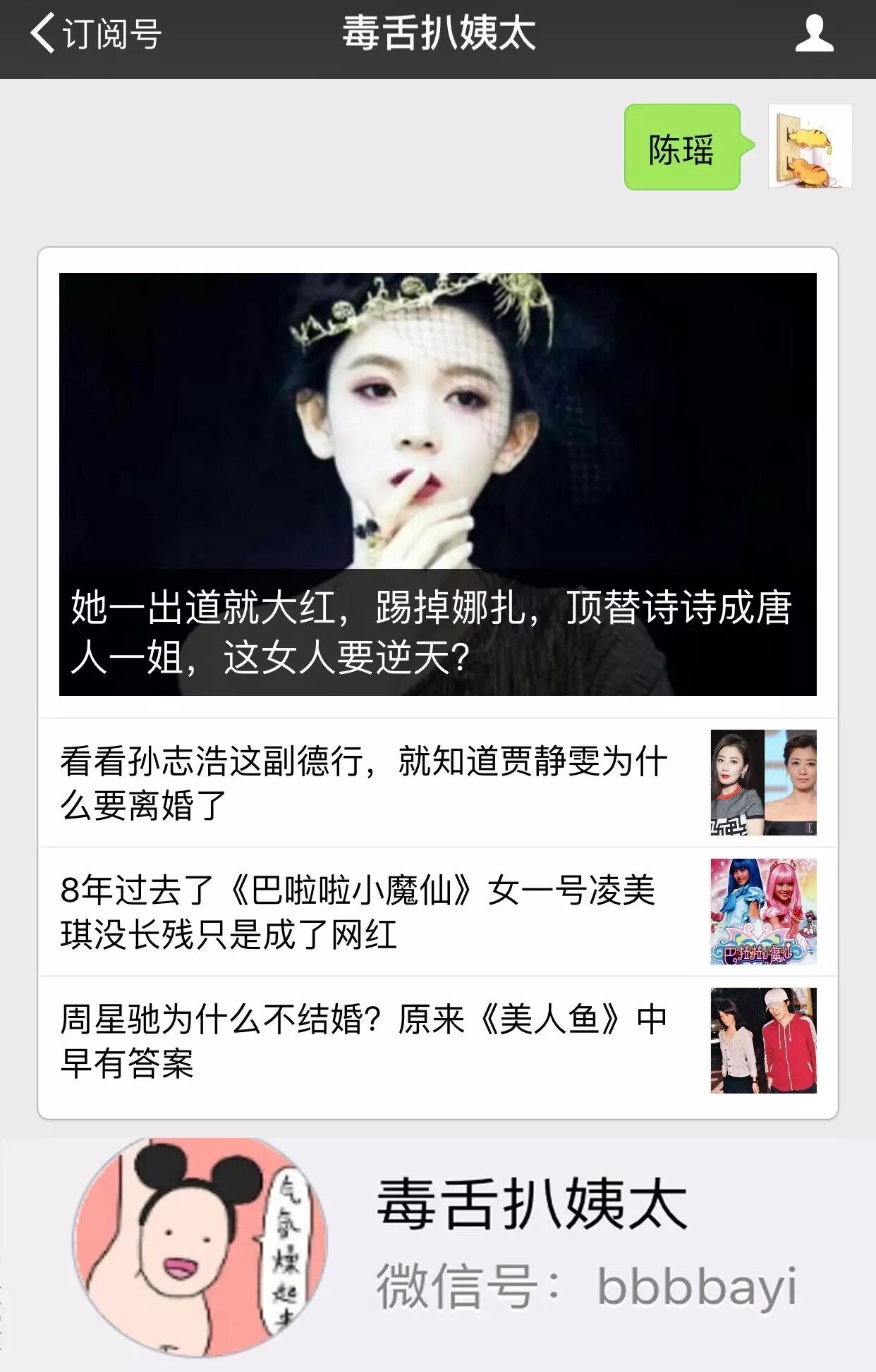 看扒姐一个人讲八卦腻不?来关注扒姐CP,毒舌扒姨太吧!一手明星猛料,时尚小公举,最浪毒舌妇就是她! 关注后回复关键词:【陈瑶】 就有猛料哦!