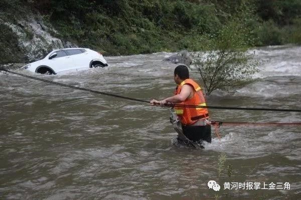 出警途中,指挥员多次与报警人取得联系,得知一名被困人员已经自救,脱离了危险。15时32分,卢氏大队接到110指令称,青山路段塌方,要求消防队返回上高速;17时20分,消防官兵几经周折后到达现场,经现场侦查及询问报警人得知,由于4日凌晨至今,卢氏县西南地区普降大雨,大雨导致河水猛涨,一辆国庆期间乘坐3人的私家车被大水冲向河中央,所幸一名被困人员经过自救已经脱离危险。此时2名被困人员正被洪水围困在河中央的一颗柳树下,四周河流湍急、水势凶猛,被困地点距岸边20米,通向岸边的道路完全被齐腰深的急流淹没,如果强行过河,将面临被冲走的生命危险。因该河段沙坑遍布,最深处可达4米。由于受上游降雨和山区地表径流“漏斗效应”的双重影响,水流异常湍急,流速达到每秒7米,河水浑浊,河水不断上涨,救援风险极大。