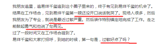 过一阵她又在工作场合见到易烊千玺,他对她说的第一句话是:“过敏好点了吗?”