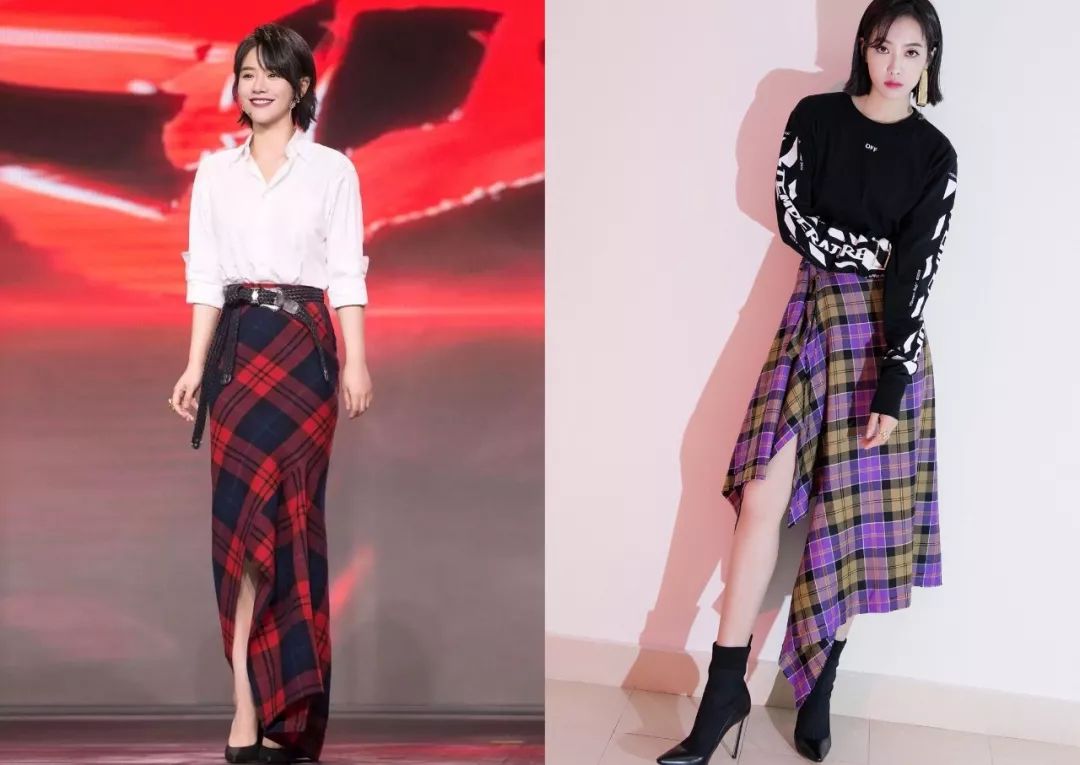 经典的格纹裙开个叉就够时髦,马思纯这条开叉及膝的半身裙显瘦效果显而易见,而宋茜这条膝上十公分的开衩拉长了自身比例,完美展现大长腿,又酷又性感!▼