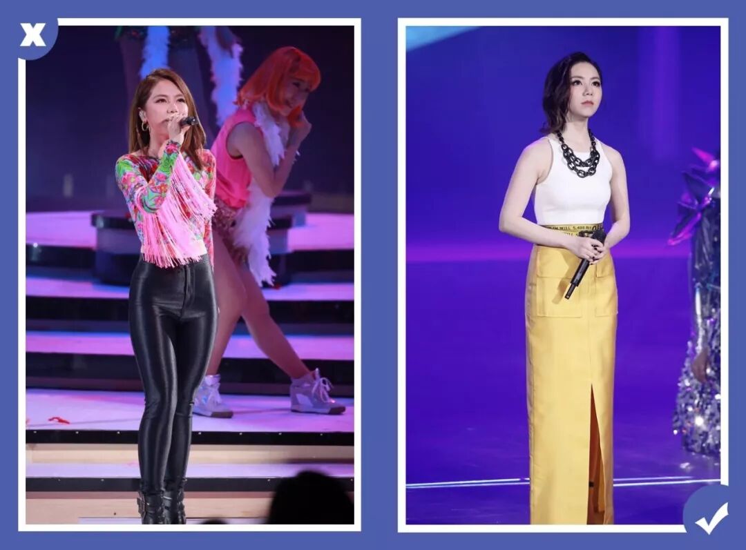 邓紫棋终于跳出皮裤的雷池,她一改以往的风格,以一席亮黄色开衩半裙亮相春晚,开衩半裙很好的掩饰了她腿部的缺点▼