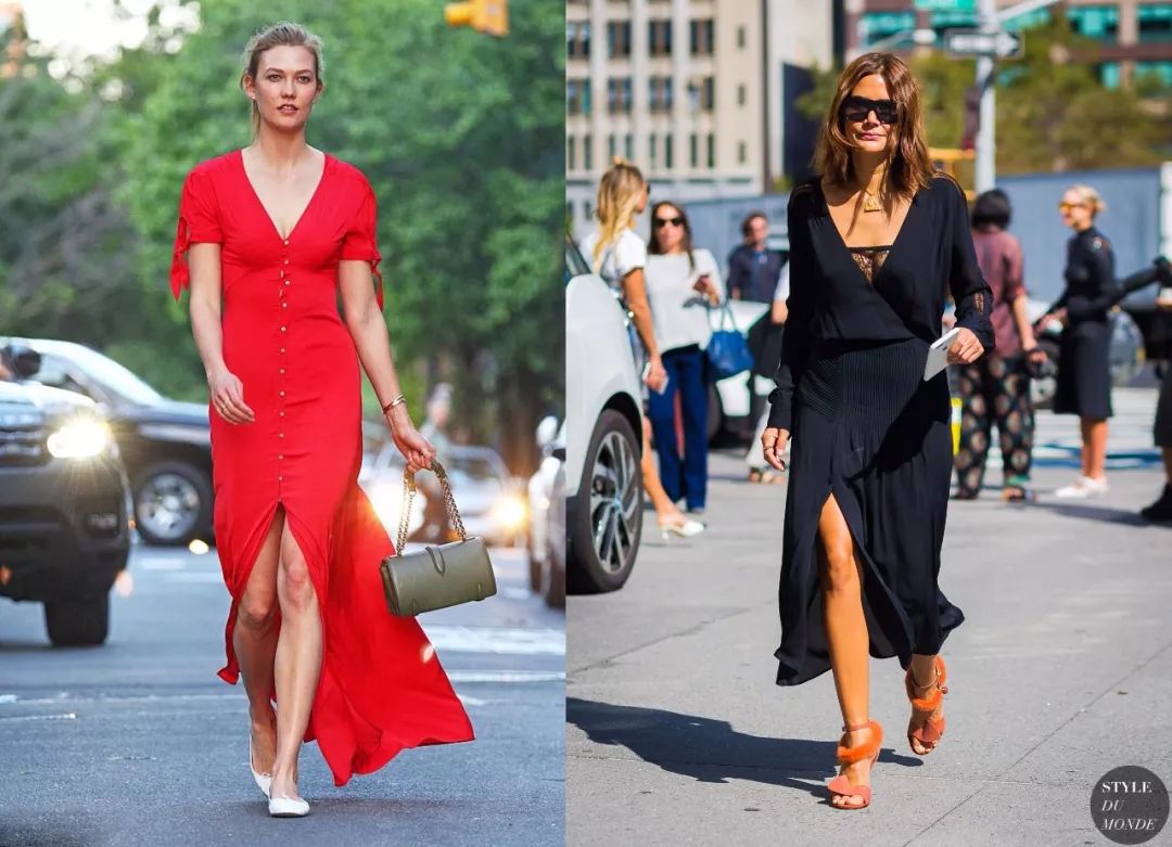 想要偷懒的妹子可以选择开衩式的连衣裙,正面开衩的设计打破了纯色连衣裙的单调感,小kk这身带有一排纽扣设计的复古红裙,文艺又性感▼