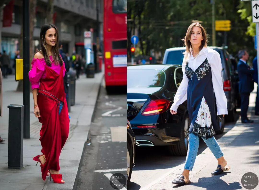 而吊带开衩裙+裤装的穿法打造了不同的层次感,走路带风的效果也是十分的吸睛,像带有拼接的开衩,更是丰富了整个设计▼
