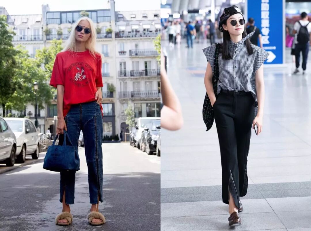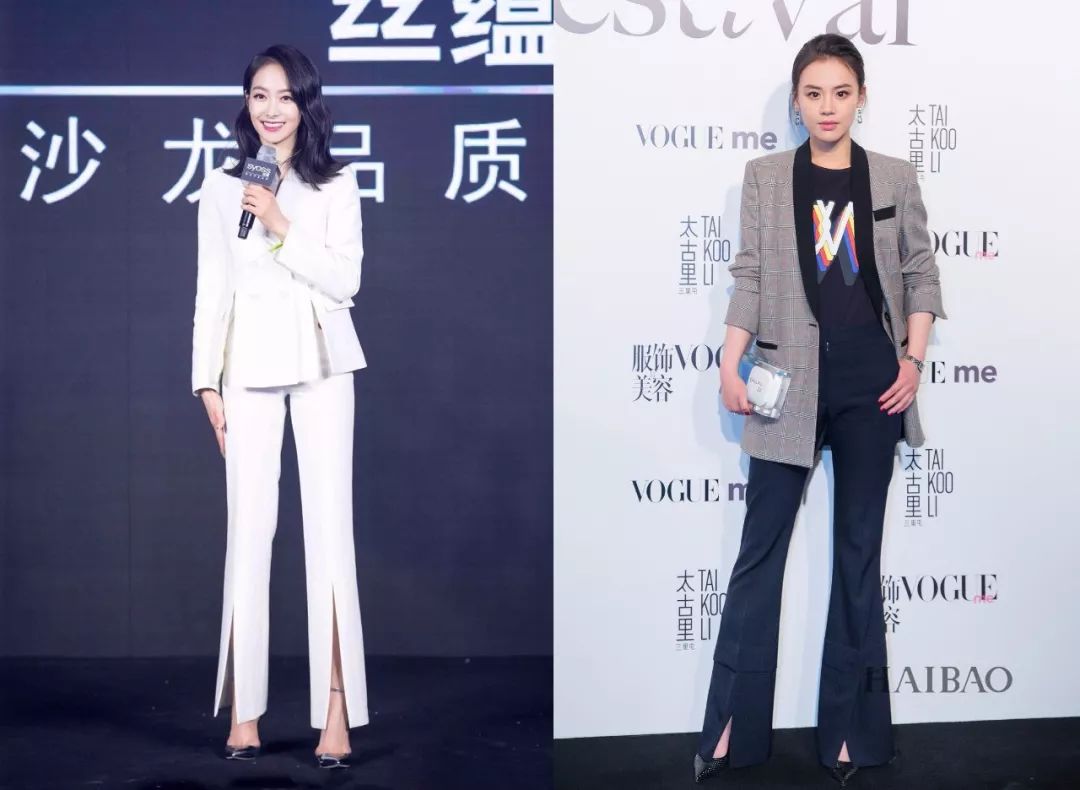 想把裤子穿的时髦,除了卷裤脚,你还需要一条开衩裤~开衩裤能够很好的修饰腿型,宋茜和马思纯用西装外套搭配开叉设计的喇叭裤,有效地拉长了腿部的比例,气质干练又不失复古。▼