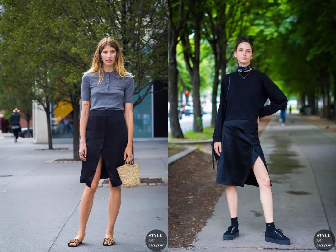 如果你想在优雅之余再多一点小性感,那一定要尝试一下开叉半身裙这个超撩人的单品。黑色开叉裙超级百搭,选择同色系的搭配更显高级,如果想有亮点,那么一条印花丝巾就可以打破这种单调感▼