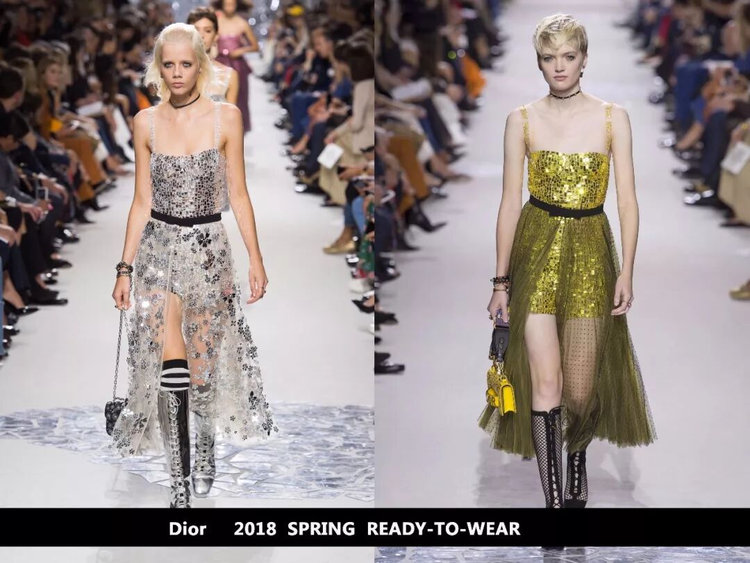 修饰身材效果极佳的开衩设计在秀场上也深受设计师们的喜爱,Dior2018春夏系列将裙装打造成开衩设计,破碎式亮片与开衩的薄纱相结合,闪亮迷人▼