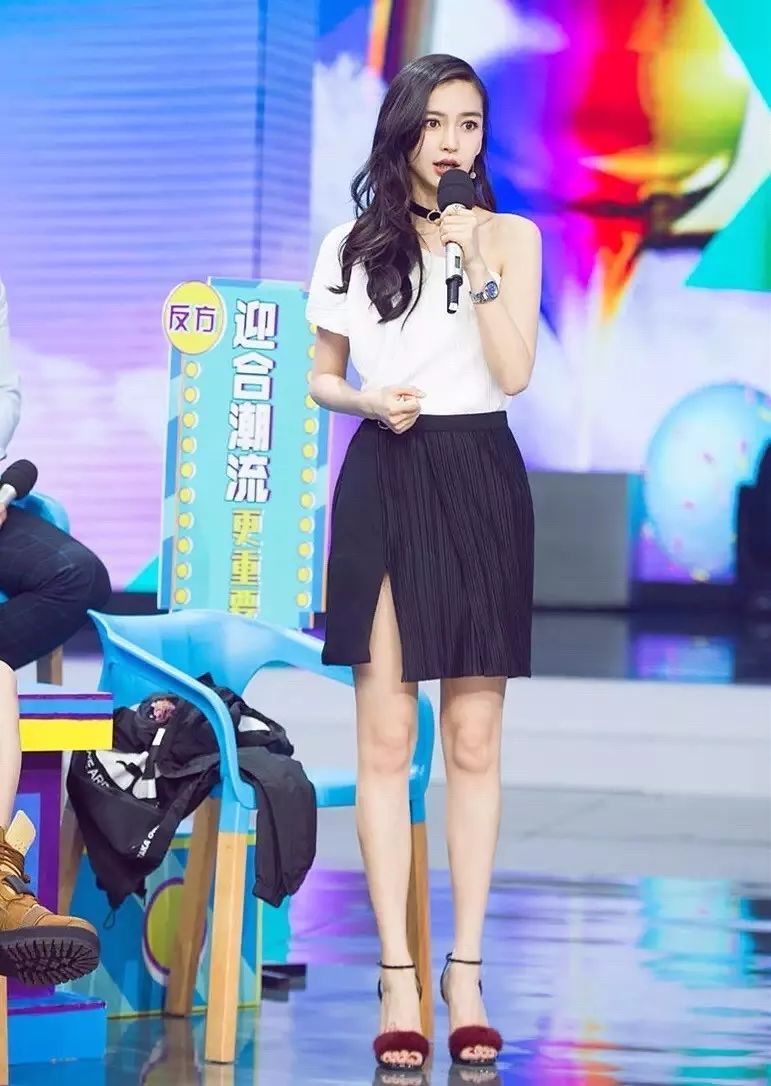 Anglebaby身穿高腰开叉短裙搭配白色斜肩上衣,裙子的开衩和褶边的结合设计感十足,简单的黑白配也让人感到十足的时髦~▼