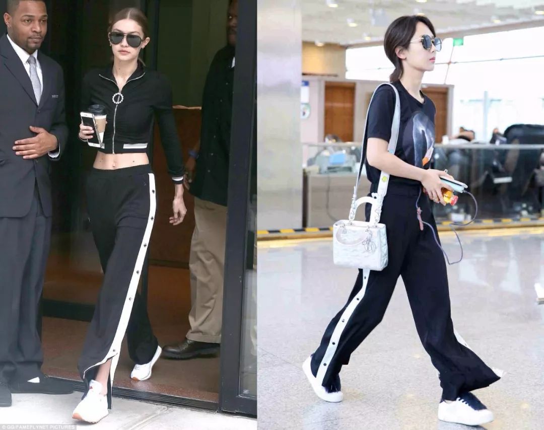 宋茜这身撞色运动外套混搭黑色皮裙,短款的开衩裙更能展现身材,搭配一双小白鞋,休闲中带有一点小性感▼