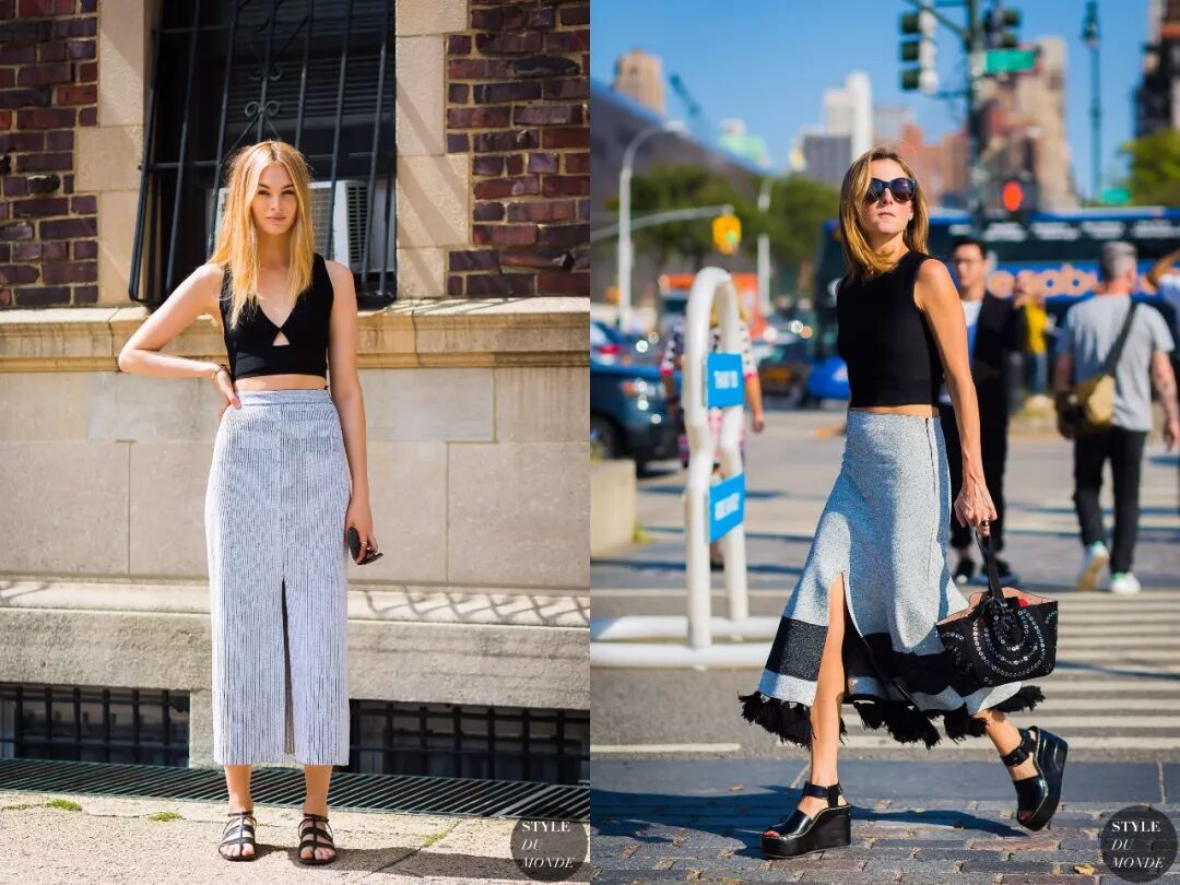 开叉裙+crop top背心这个极简的搭配,在夏日里时髦又清凉,富有细节感的条纹和流苏使整个造型更加特别▼