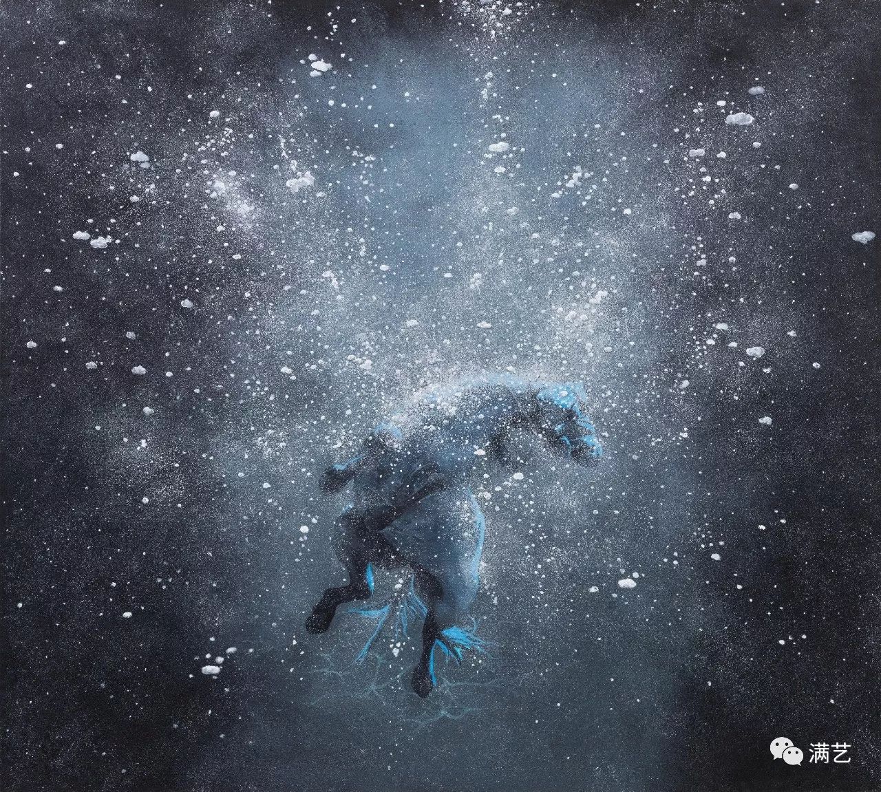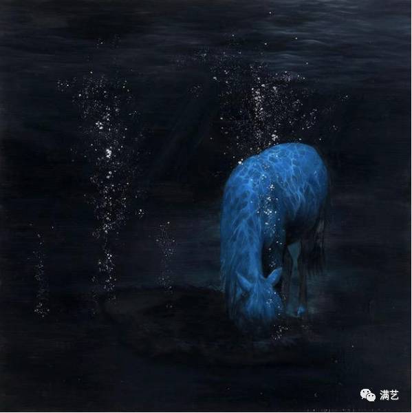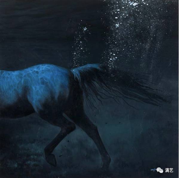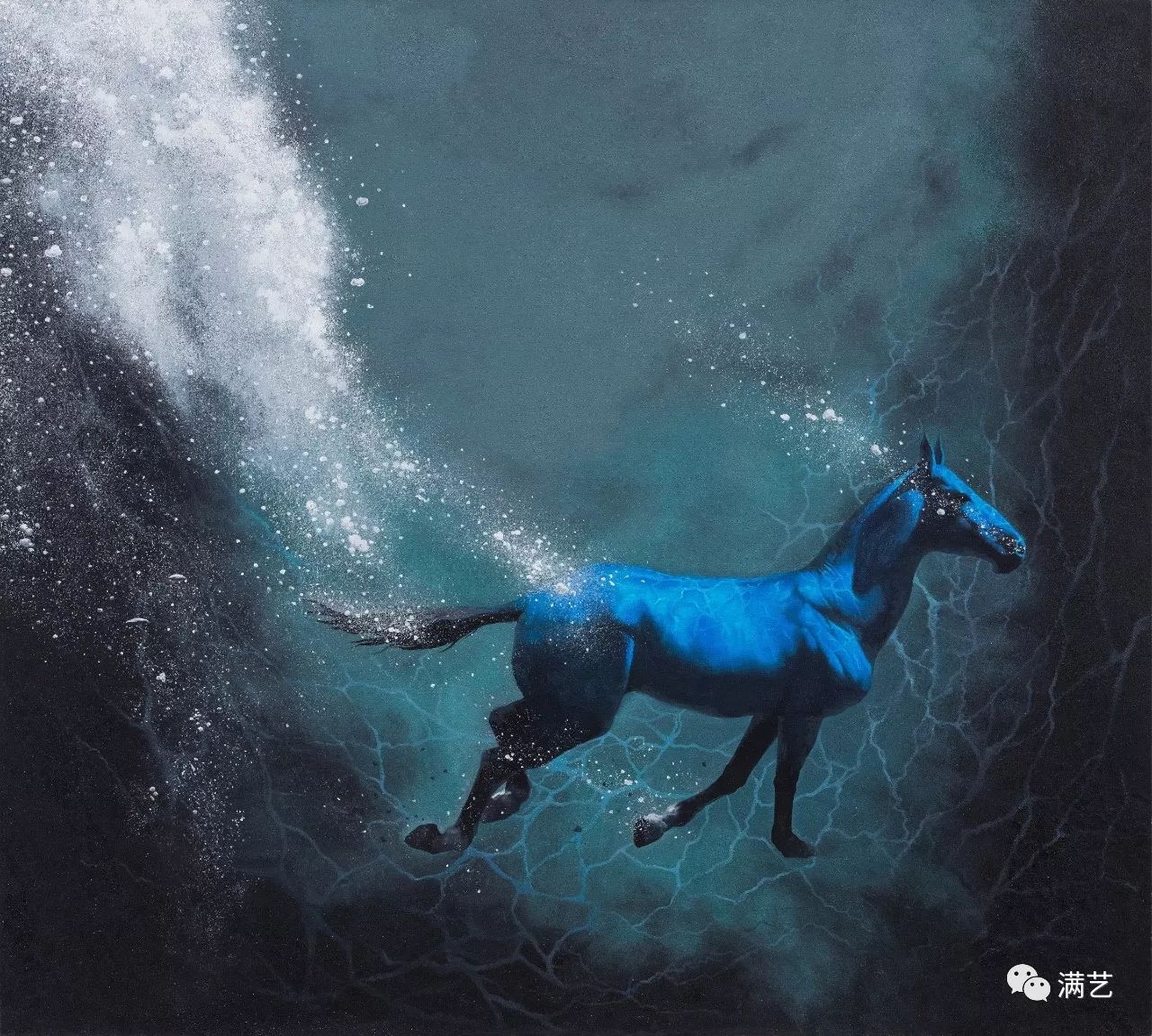 新系列作品中马的全身用明亮的蓝色处理,画面中成串的气泡形态让人感觉一切被置于水下。除马之外的物象都是暗灰色调,虚无的深色背景仿佛是无边际的宇宙空间。