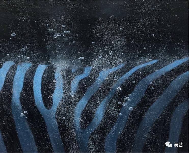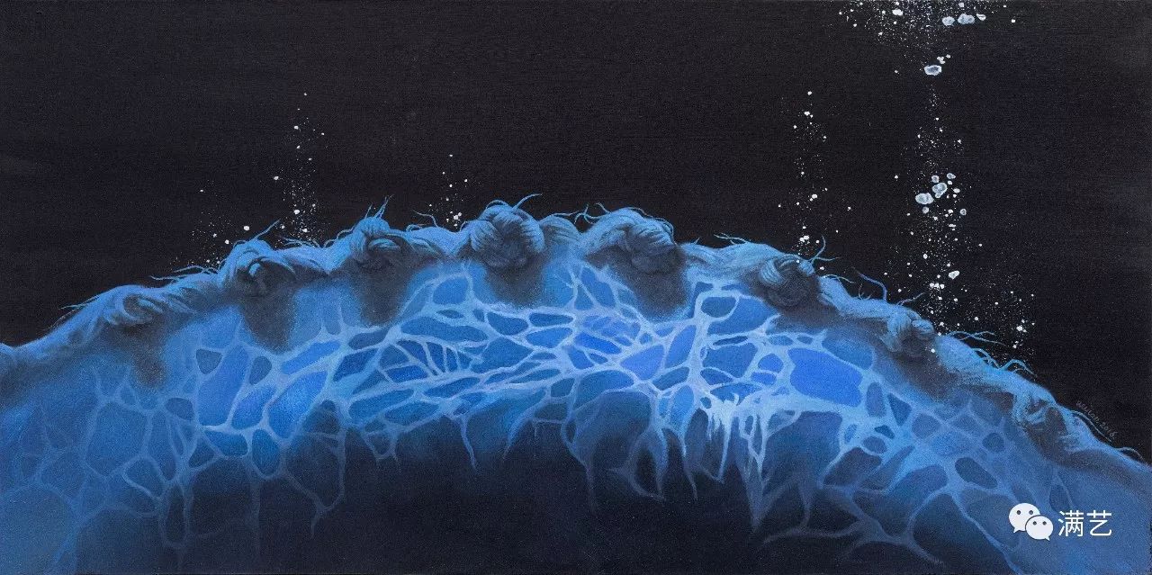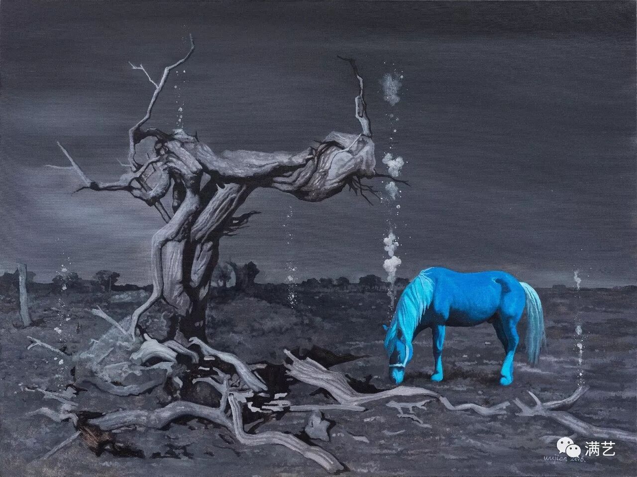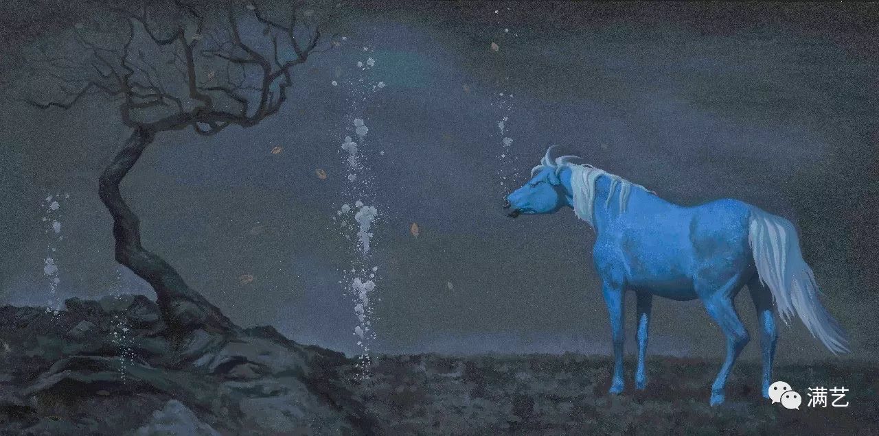 新系列作品中马的全身用明亮的蓝色处理,画面中成串的气泡形态让人感觉一切被置于水下。除马之外的物象都是暗灰色调,虚无的深色背景仿佛是无边际的宇宙空间。