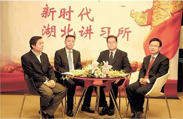 1月16日,湖北日报全媒记者杨宏斌与受邀嘉宾熊征宇(左二)、宋晓波(右一)、欧阳康(右二)一起进行访谈节目直播。(湖北日报全媒记者 梅涛 摄)