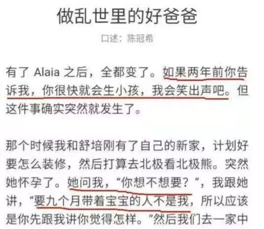 近期,陈冠希之前的一段采访被曝光,陈冠希自曝秦舒培在怀孕后心情也很纠结,本来两人是一起去看新家的,然后秦舒培却突然告诉陈冠希自己怀孕了,而且还问陈冠希:“你要不要?”而陈冠希的回答可以说是教科书级别了。陈冠希说要怀孕九个月的人是你,所以应该你拿主意。不得不说,陈冠希的这个回答真的是给了秦舒培尊重,而且秦舒培想生下孩子的时候,陈冠希也是毫不犹豫的担起了男人的责任!真的是很宠秦舒培了!