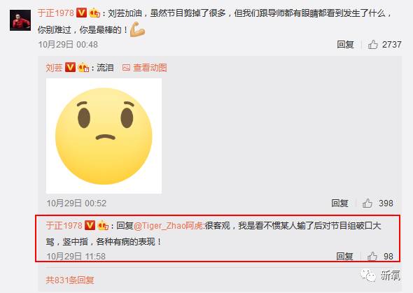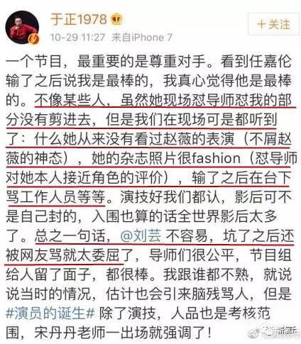 但是谁也没想到,节目播出后,事情竟然还有后续。先是在现场全程录制节目的于正在评论里安慰鼓励刘芸,同时暗指黄璐输了之后对节目组破口大骂、竖中指等不礼貌行为。