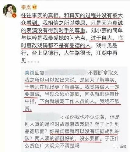 之后刘芸的好闺蜜秦岚明显相信了于正的一系列证词,于是也亲自下场撕。指责黄璐过于自大,临时篡改戏码,没有品德。