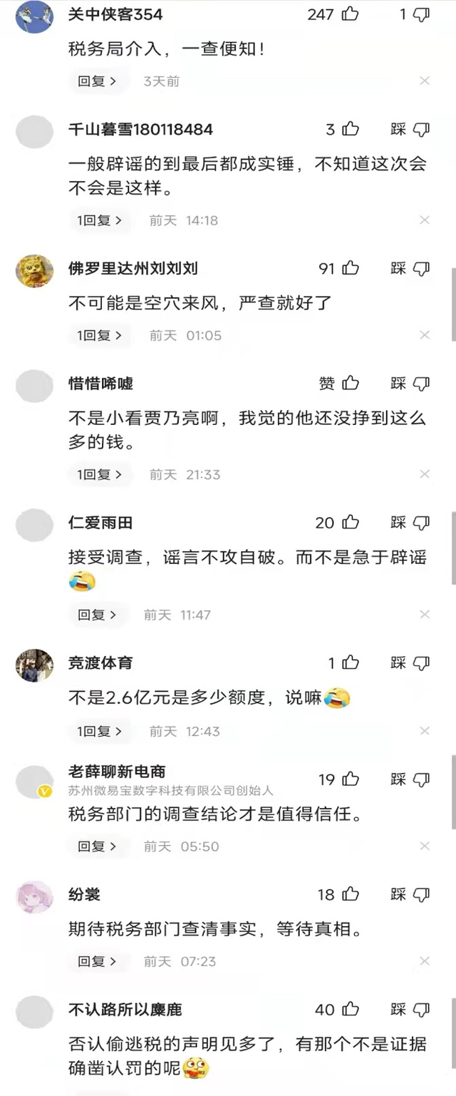 不少网友们在评论区发表看法:税务局介入,“一查便知!”“接受调查,谣言不攻自破。而不是基于辟谣”“税务部门的调查结论才是值得信任”“期待税务部门查清事实,等待真相”………