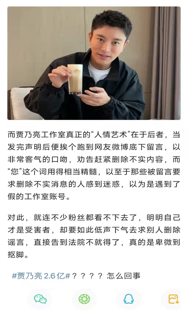 该文表示:“贾乃亮工作室发完声明后便挨个跑到网友微博底下留言,以非常客气的口吻,劝告赶紧删除不实内容,而‘您’这个词用得相当精髓,以至于那些被留言要求删除不实消息的人感到迷惑,以为是遇到了假的工作室账号。”