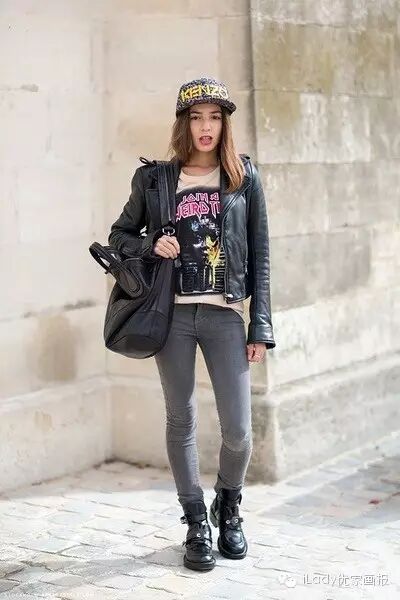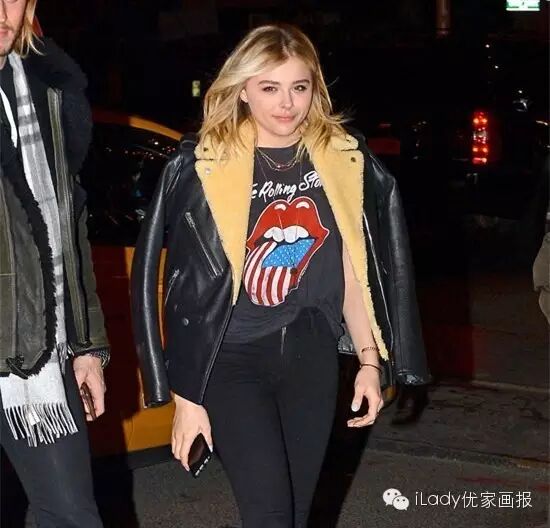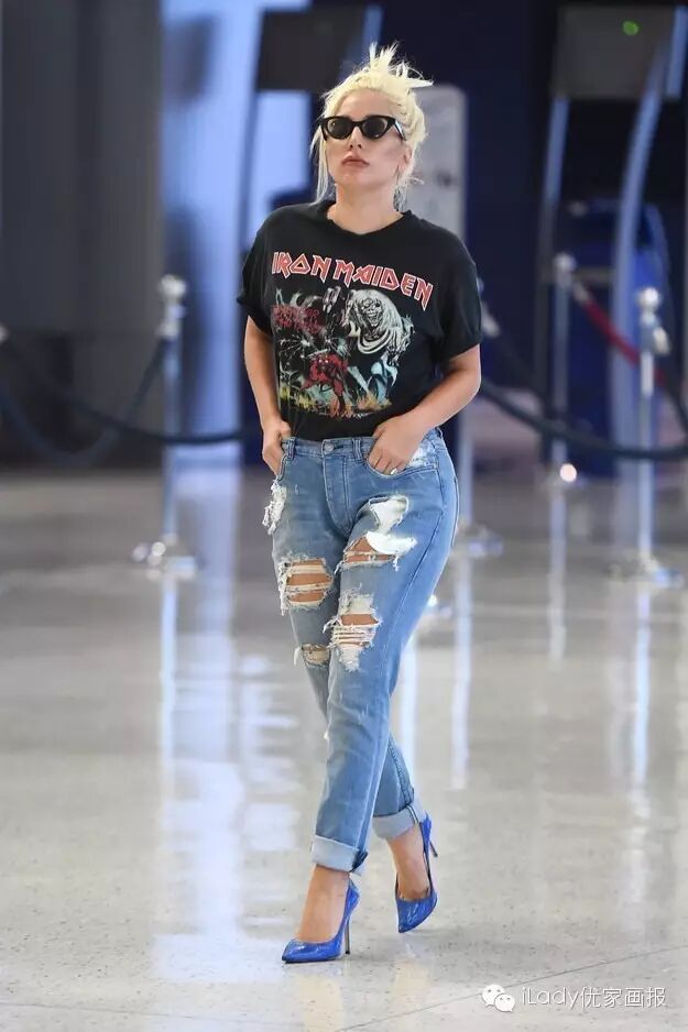 Gaga姐随意又霸气地套上烫画T恤,穿着破铜牛仔就出街,胸前印着的Iron Maiden(铁娘子乐队)Logo赫然表明了Gaga姐的摇滚态度。