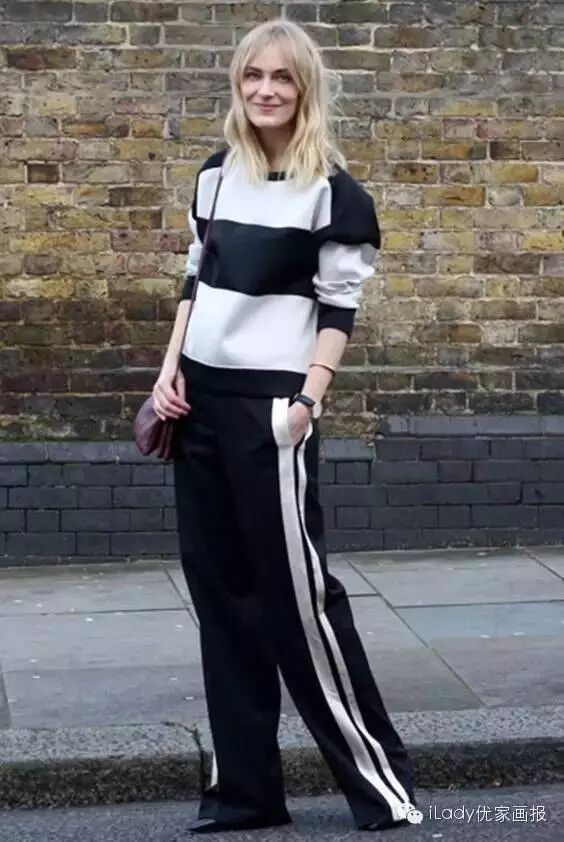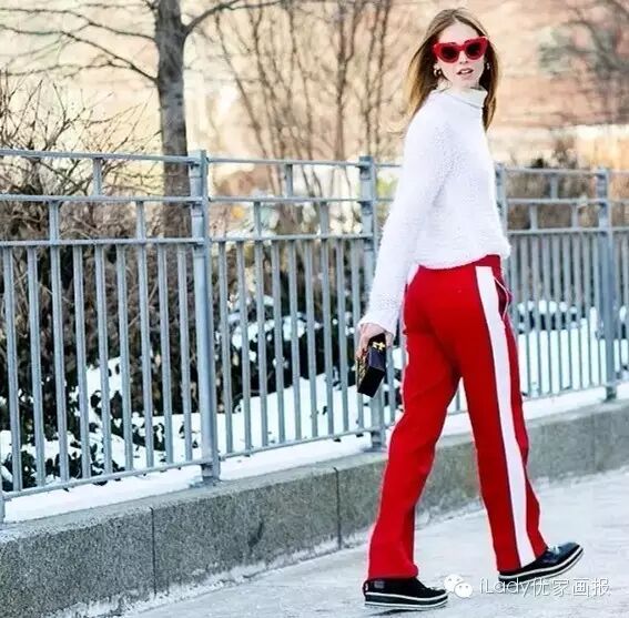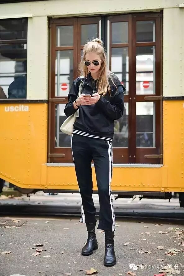 当大家以为运动装只能表现单一的风格时,Elena却证明:它也可以诠释出优雅。高腰设计+裤缝的那条白线,让视线都集中在腿部,再在裤子里藏一双恨天高,简直就是“胸部以下都是腿”的即视感。