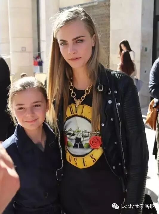 同样喜欢乐队烫画T恤的还有一向鬼马不羁的Cara,T恤上印的是美国硬摇滚乐队Guns N' Roses(枪炮与玫瑰)的经典图案。