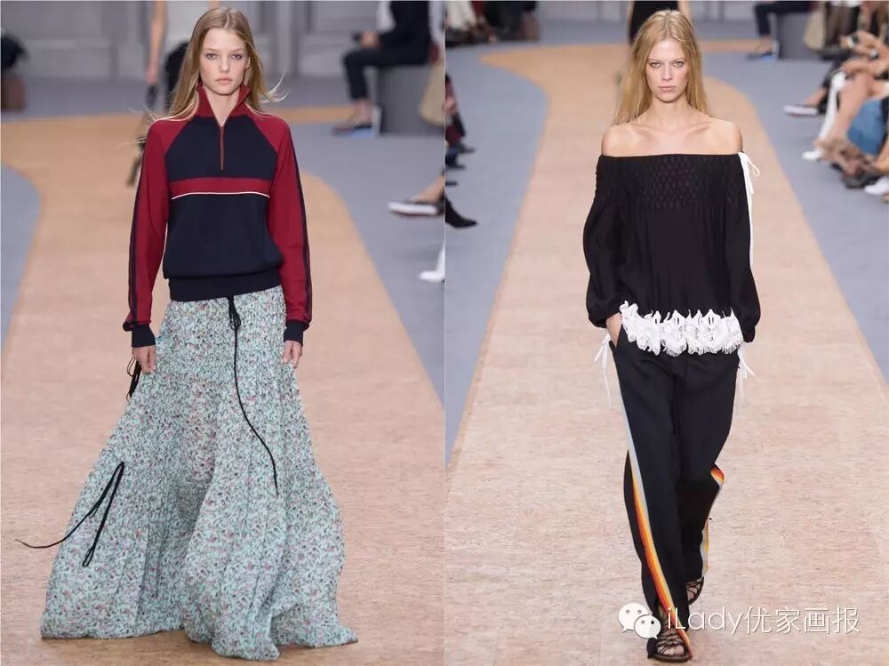 除了成套地穿着时髦的“高中校服”,Chloé 2016春夏系列为大家展示了不少好方法,比如用运动衫搭配雪纺仙裙,或是用一字领上衣配上运动裤,碰撞出令人耳目一新的Sporty感。