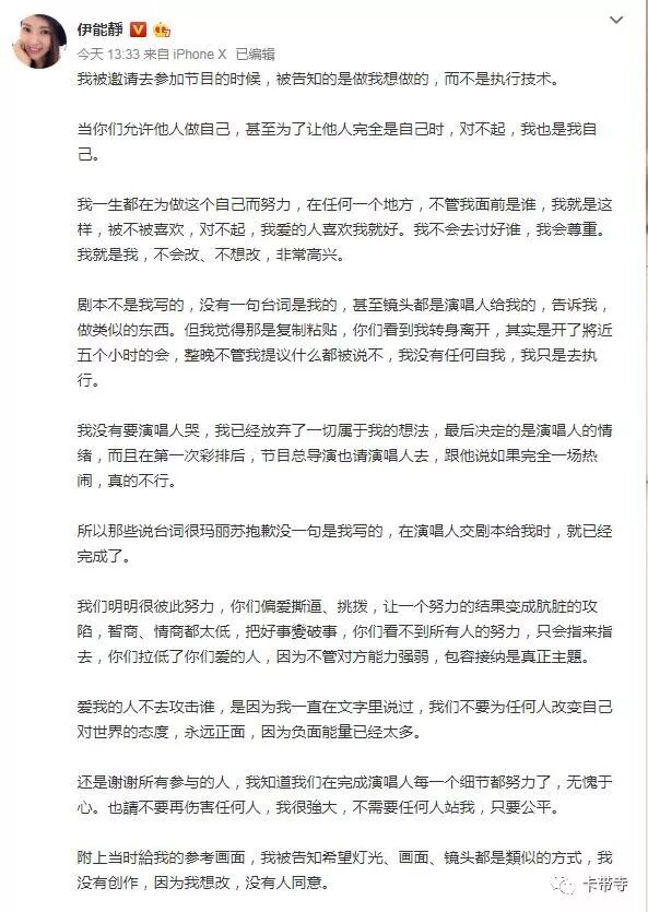 随后伊能静又发长文,称"我被邀请参加节目的时候,被告知的是做我想做的,而不是执行技术",此外她还表示"剧本不少我写的,没有一句台词是我的,甚至镜头都是演唱人给我的"。