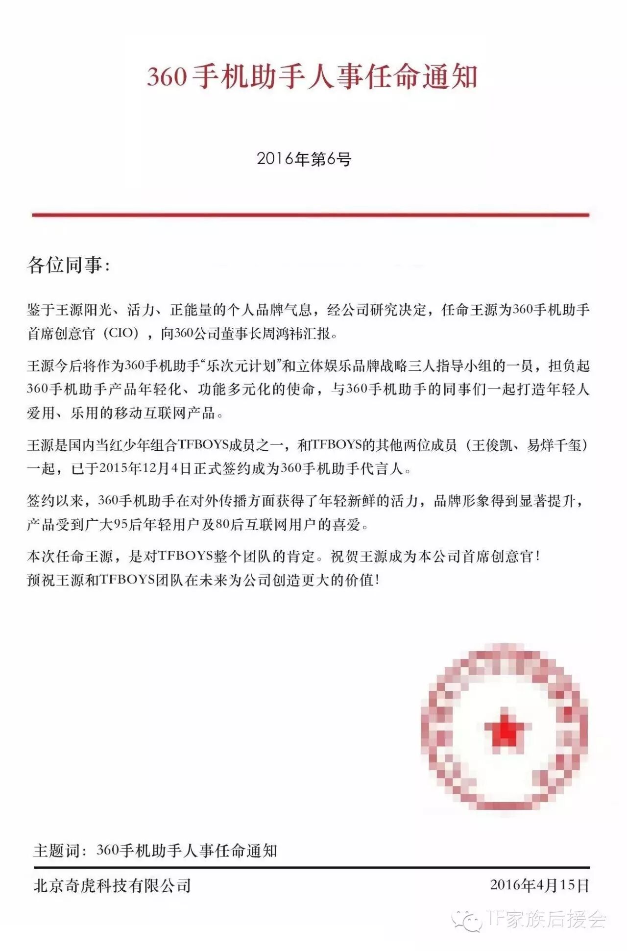 360手机助手再添新领导——王源 TF家族后援会 内地男星 2016-04-20 12:33:36 349 创作不易,用心坚持,欢迎请BaGua喝几杯爱心咖啡!打赏并支持本文 打赏并删除本文 #TFBOYS##陪TFBOYS成长# 360手机助手再添“新领导”——首席创意官王源(CIO) 命运偏爱有才华的人,机会宠爱有新鲜idea的人,期待你带来更多的不可思议 @TFBOYS-王源 创作不易,用心坚持,欢迎请BaGua喝几杯爱心咖啡!打赏并支持本文 打赏并删除本文 感谢您的支持鼓励,我会继续努力的!文章地址:用户邮箱:打赏金额:USDT 请输入数字点击”去打赏“,即可进行打赏支持本文章哦 王源 About the Author TF家族后援会 功能介绍:TF家族粉丝团,这里有tfboys最新动态、照片、音乐、视频,同为四叶草的你还不赶紧加入! 官方认证:深圳市福田区女神女王文化传媒工作室 Related Posts 王源表情包分享 小肥实力可爱 2017-06-12 11:42:01 王俊凯北京飞重庆 小熊T恤好可爱啊 2016-08-25 16:41:08 TFBOYS王俊凯表情包来袭了 2016-08-20 18:16:41 易烊千玺深夜放毒 2016-06-27 17:35:28 TFBOYS 王源艺考第一 2016-06-22 17:33:40 发表评论