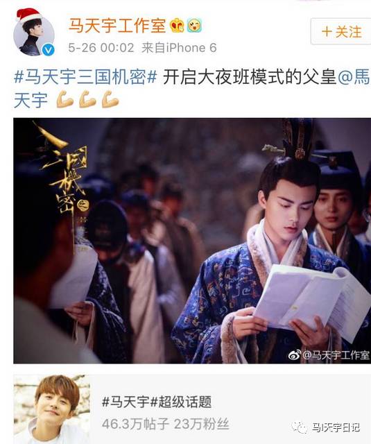 26号凌晨马天宇工作室分享一张陛下正认真看剧本的图片,“开启大夜班模式的父皇”。